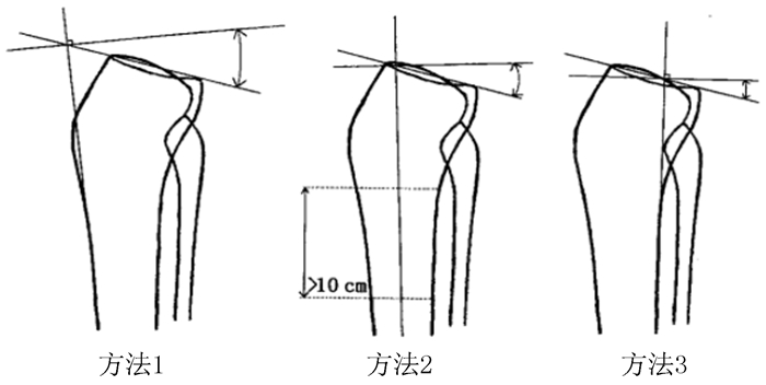 1.4 随访术后6周病人门诊复查指导康复锻炼,术后4个月再次门诊复查采集相关数据。检测指标包括BMI,术前及术后4个月KSS评分、膝关节ROM、胫骨平台PSA。病人术前、术后行负重位置膝关节正侧位X线检查,保证侧位X线片股骨内外髁重叠,分别应用3种方法测量胫骨平台PSA:①胫骨平台前后缘连线与胫骨中上段前侧骨皮质切线的垂线的夹角(图 1方法1);②胫骨平台前后缘连线胫骨中上段轴线的垂线的夹角(图 1方法2);③胫骨平台前后缘连线与胫骨后侧皮质切线的垂线的交角(图 1方法3)。ROM测量时病人取仰卧位,应用量角器测量。