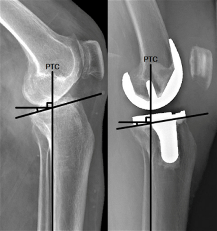 PTC为胫骨后侧皮质切线,斜线为胫骨平台前后缘连线,PTC垂线与斜线的夹角就是测量的角度,未安装假体为术前,安装假体为术后。 图 2 方法3测量胫骨平台PSA |