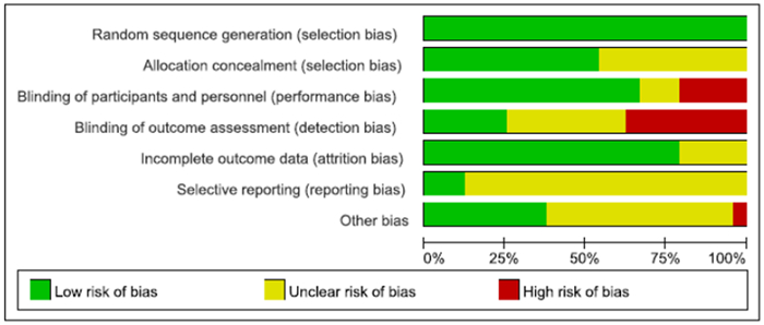 1.4 文献质量评价按照Cochrane系统评价手册要求,采用RevMan 5.3软件对每一项纳入的研究进行偏倚风险评估。包括随机序列的产生是否正确,是否采取了分配隐藏,盲法的实施是否完善,观察数据是否完整,是否有选择性报道结果以及其他偏倚。