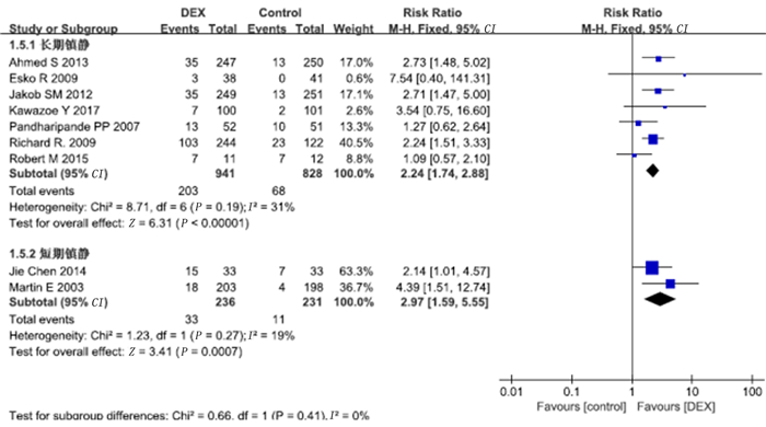 有14项研究报道了心动过缓病例数,其中7项研究符合长期镇静的标准,2项研究符合短期镇静的标准。Meta分析的结果显示,右美托咪定组病人心动过缓发生率较对照组明显增加(RR=2.29,95%CI=1.87~2.79,P<0.01)。见图 9。长期镇静亚组中右美托咪定组的心动过缓发生率较对照组明显增加(RR=2.24,95%CI=1.74~2.88,P<0.01),短期镇静亚组中右美托咪定组病人心动过缓发生率也较对照组明显增加(RR=2.97,95%CI=1.59~5.55,P<0.01)。见图 10。