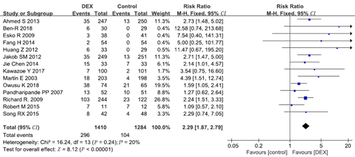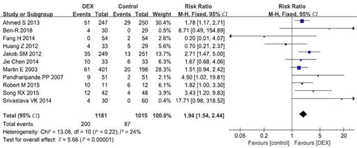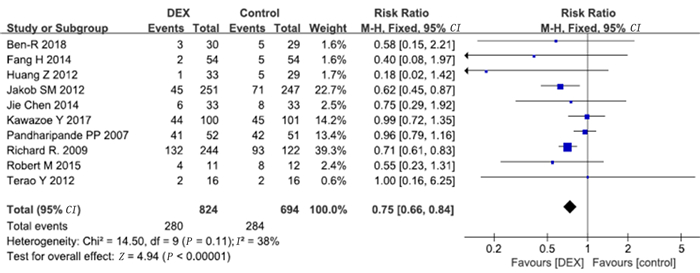 图 11 右美托咪定对低血压发生率影响的Meta分析 |