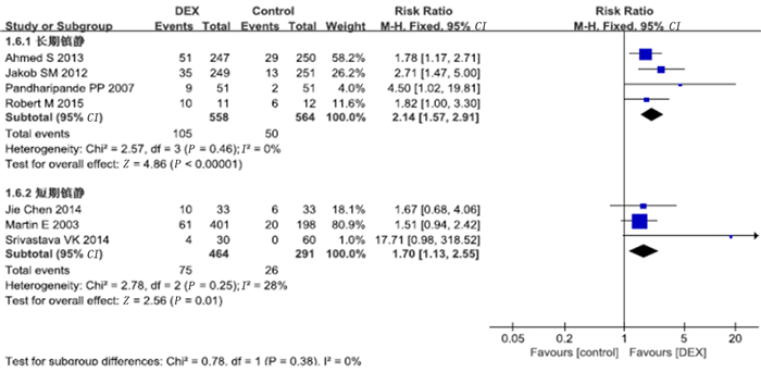 12项研究报道了低血压病例数。数据合并后发现存在较大异质性,检查后发现RICHARD的研究为异质性来源,对其进行敏感性检测后发现其不影响数据结果,剔除该组数据后将剩余数据再次合并,同时将符合标准的4项研究纳入长期镇静亚组,3项研究纳入短期镇静亚组。Meta分析显示,右美托咪定组的低血压发生率较对照组明显增加(RR=1.94,95%CI=1.54~2.44,P<0.01)。长期镇静亚组中右美托咪定组低血压发生率较对照组增加(RR=2.14,95%CI=1.57~2.91,P<0.01),短期镇静亚组中右美托咪定组低血压发生率也较对照组增加(RR=1.70,95%CI=1.13~2.55,P<0.01)。见图 11、12。