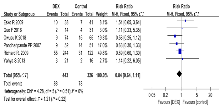 图 7 右美托咪定对谵妄发生率影响的Meta分析 |