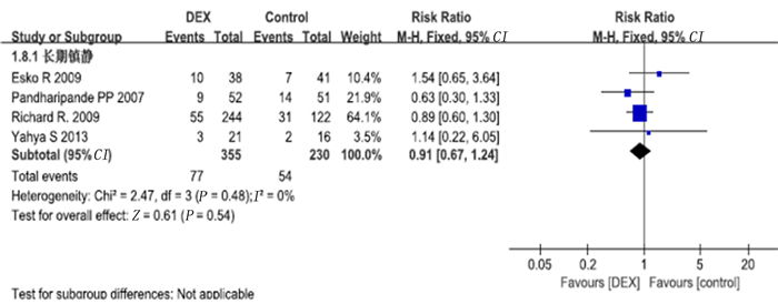 d病死率的影响6项研究报道了28 d死亡病例数,其中4项符合标准的研究纳入长期镇静亚组,无研究符合短期镇静标准。Meta分析显示,右美托咪定组的28 d病死率与对照组比较无明显改善(RR=0.84,95%CI=0.64~1.11,P>0.05)。长期镇静亚组中右美托咪定组病人28 d病死率与对照组相比较无改善(RR=0.91,95%CI=0.67~1.24,P>0.05)。见图 13、14。