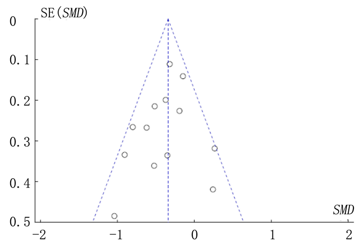 本研究存在一定的局限性:①某些研究提供的数据为中位数及四分位数形式,在应用适宜的统计学方法后虽然可将其最大限度地转化为近似的均数及标准差,但仍可能存在误差,影响分析结果;②本Meta分析漏斗图显示存在一定的发表偏倚,但并不严重;③纳入短期镇静组的研究数量较少,结果的可靠性有待进一步研究验证。