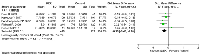 7项研究报道了右美托咪定对病人机械通气时间的影响。将中位数和四分位数数据转换为均数及标准差后对7项研究的数据进行Meta分析,结果显示,右美托咪定组的机械通气时间较对照组显著缩短(SMD=-0.20,95%CI=-0.33~-0.08,P<0.01)。见图 3。同时对4项长期镇静(镇静持续时间>24 h)以及1项短期镇静(镇静时间≤24 h)研究进行了亚组分析,结果显示,长期镇静亚组中右美托咪定组机械通气时间较对照组显著缩短(SMD=-0.15,95%CI=-0.29~-0.01,P<0.01),而短期镇静亚组中右美托咪定组的机械通气时间与对照组比较差异无统计学意义(P>0.05)。见图 4。