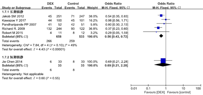 10项研究报道了谵妄病例数。Meta分析显示,右美托咪定组的谵妄发生率显著低于对照组(OR=0.75,95%CI=0.66~0.84,P<0.01)。见图 7。同时对5项长期镇静及1项短期镇静研究进行了亚组分析,结果显示,长期镇静亚组中右美托咪定组谵妄发生率显著低于对照组(OR=0.56,95%CI=0.43~0.72,P<0.01),短期镇静亚组中右美托咪定组与对照组谵妄发生率比较差异无显著性(P>0.05)。见图 8。