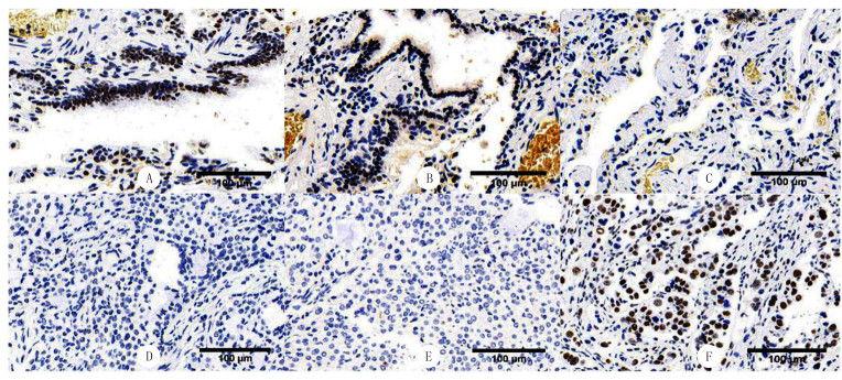 A~C为肺腺癌组织,D~F为癌旁组织。A、D为METTL3;B、EYL METTL4;C、F为WTAP。 图 2 肺腺癌和癌旁组织中RNA甲基化转移酶的表达检测 |