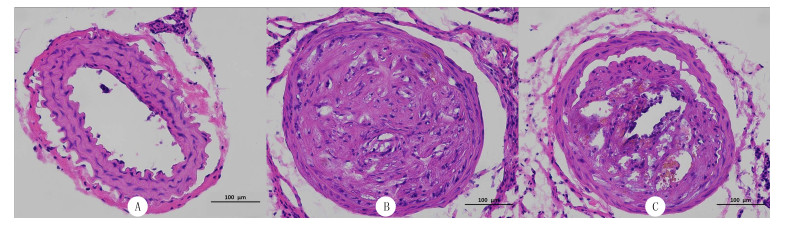 1.3.3 病理观察将离体的右侧颈总动脉用40 g/L多聚甲醛固定,乙醇脱水、浸蜡包埋、切片,苏木精-伊红(HE)染色,光镜下观察血管动脉粥样硬化形成情况。