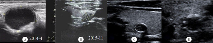| A、B为1例病人甲状腺结节体积缩小观察。A:2014年4月左叶囊性为主的结节,最大径为2.7cm;B: 2015年11月复查,结节体积缩小,最大径为1.0 cm,并出现“双边征”及内环上点状钙化。C、D显示甲状腺结节钙化。C:结节周边不连续壳状钙化;D:放大图像后,观察到钙化外有确切的实性低回声成分,手术病理证实为PTC。 图 1 MNs体积缩小和不连续钙化的高频超声声像图特征 |