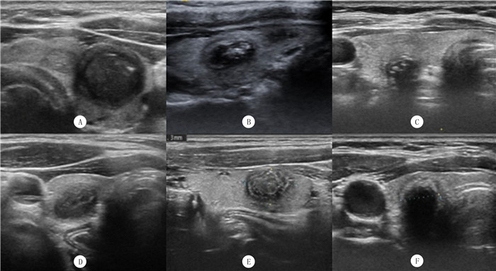 在高频声像图上,“双边征”多表现为平行/近乎平行的两个环,可占据结节一半以上的边缘部(图 2A~C):内环纤细连续,为等/略高/强回声;外环略厚或厚薄欠均匀,为低回声。内环的病理基础为皱缩过程中未被累及或遮挡而保留下来的囊壁结构,外环则为皱缩的囊壁、炎性反应带、纤维化等。值得注意的是,“双边征”在结节不同固缩状态下,有不同的表现,如囊壁收缩征[49]、指纹征或同心圆征[49]和壳状钙化等。囊壁收缩征:是指结节边缘的高回声晕,通常不完整,在其外缘可见裂隙样低回声。指纹征:当某一个方向上(如水平位)吸收比较少,而垂直位吸收比较多时,声像图表现为低回声环和高回声环呈条纹状交错出现(图 2D)。同心圆征:各方位对称性吸收,声像图表现为一个完整的低回声晕和高回声环相互嵌套而成,中央为尚未完全吸收的液性成分(图 2E)。当囊液完全被吸收后,结节进入木乃伊化的终末阶段,边缘的高回声环形成壳状或弧形强回声(图 2F)。另外,“双边征”中的低回声外环需要与PTC周边的低回声晕相鉴别,PTC的低回声晕与癌结节纤维假包膜、周边绕行血管、周围组织受压或浸润等有关[7, 46]。TAN等[49]研究表明,19.7%的MNs和37.6%的PTC可以发现晕征。因此,晕征不能鉴别良恶性结节。